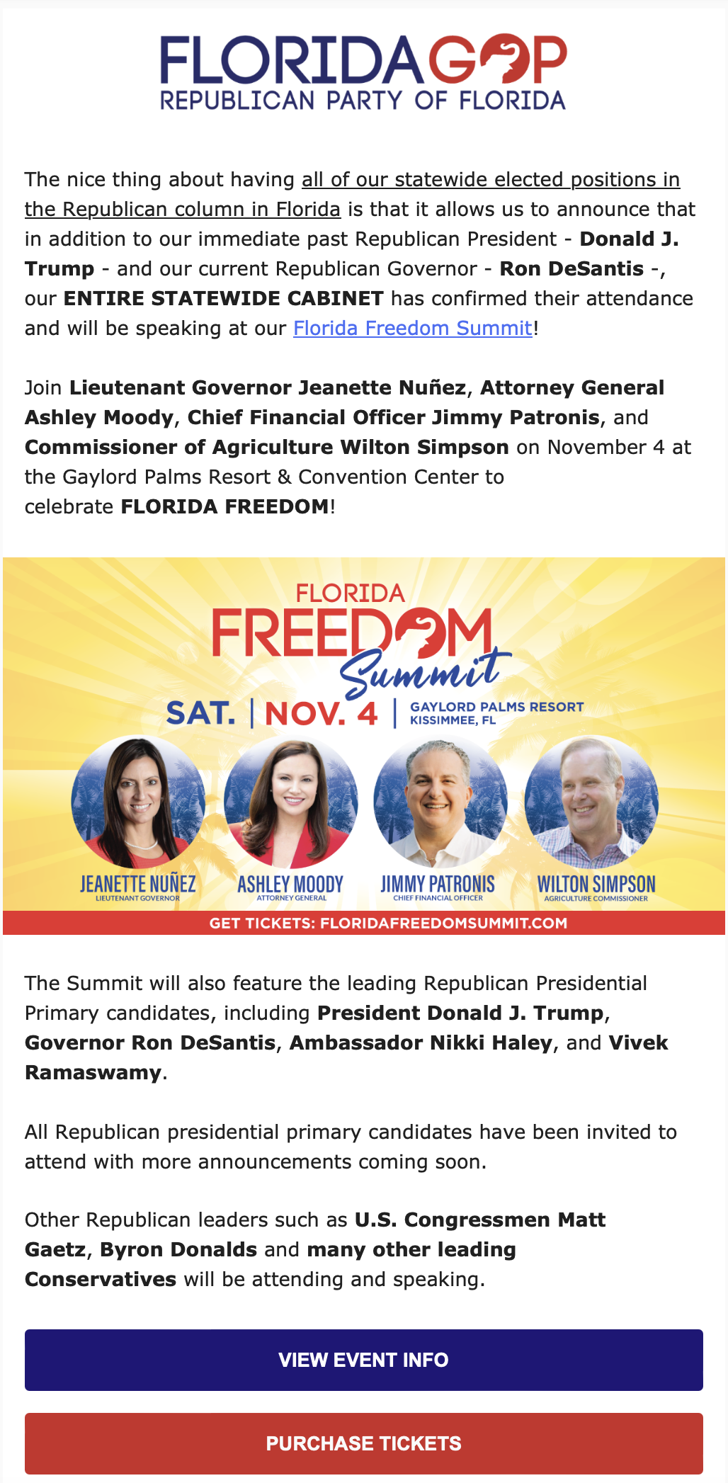 Then sign up for the Florida Freedom Summit on November 4 in Orlando. Click on the image below for more details and to purchase tickets. | |