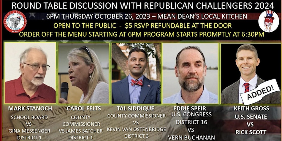 It's election season! A number of Republican candidates for various seats will be participating in a Round Table discussion being hosted by the Manatee county Republican Liberty Caucus on Thursday, October 26. This exciting event will take place at Mean Dean's local kitchen located at 6059 26th Street West Bradenton, FL 34207 starting at 6pm. So come out and engage with the candidates while enjoying some delicious cuisine Mean Dean's is known for! To register simply click the RSVP button below. | |
