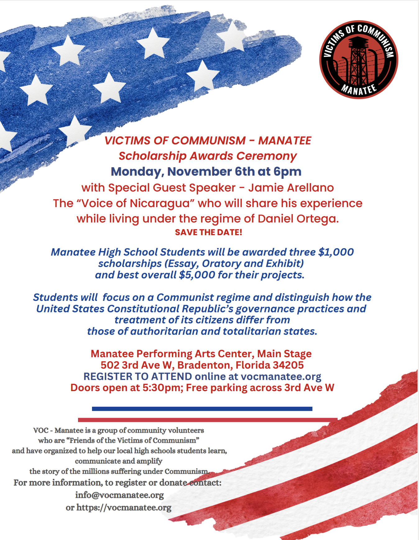 The Victims of Communism Manatee Scholarship Awards Ceremony will be held at the Bradenton Performing Arts Center on Monday, November 6. Registration begins at 5:30pm and the opening remarks start at 6:00pm.