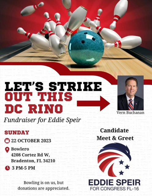 If you're like most of us, you are absolutely incensed at Rep. Vern Buchanan's outright refusal to support Rep. Jim Jordan for Speaker of the House. And you are probably enraged to see pictures of Vern enjoying a game of bowling at the White House shortly thereafter. Well if you're looking for a way to get back, why not join the Eddie Speir For Congress campaign tonight for a free game of bowling? While you're there, you can support Eddie's campaign so that Vern will no longer be bowling at the White House. | |
